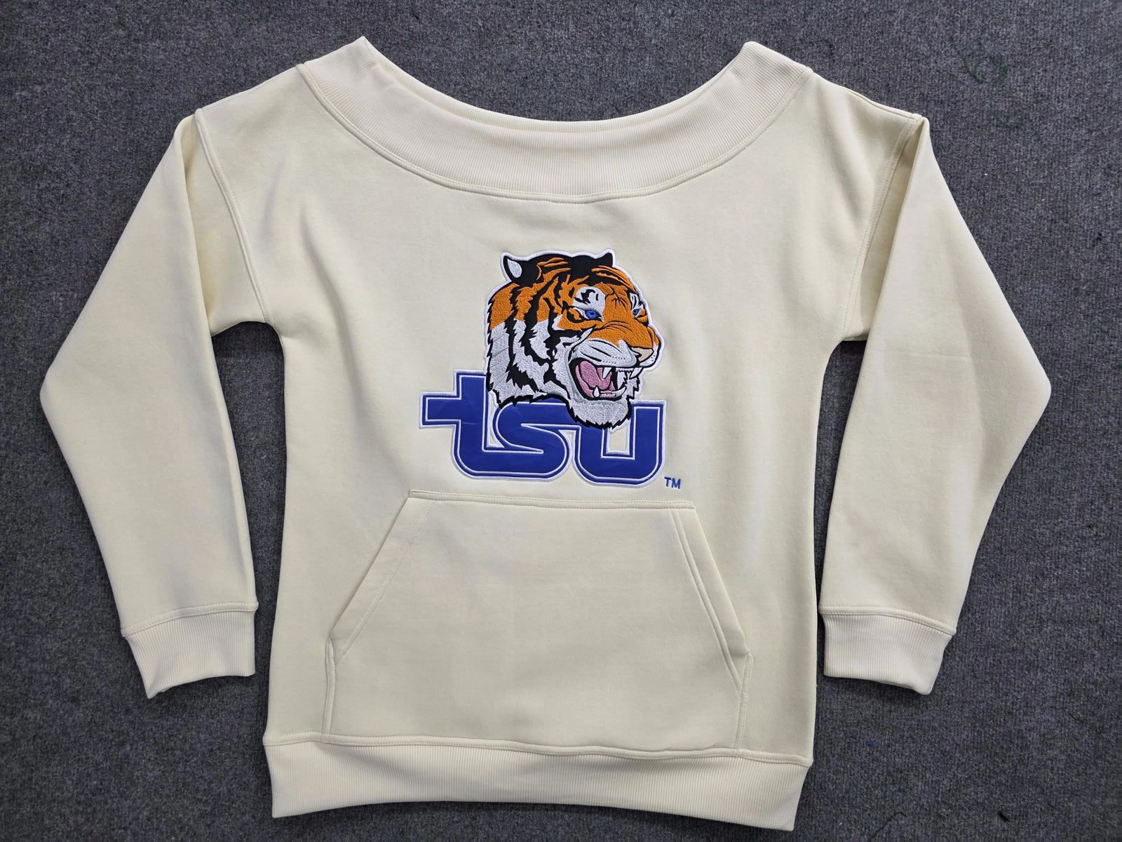 This cream off the shoulder has a full color TSU logo done with flat embroidery.  This captures...